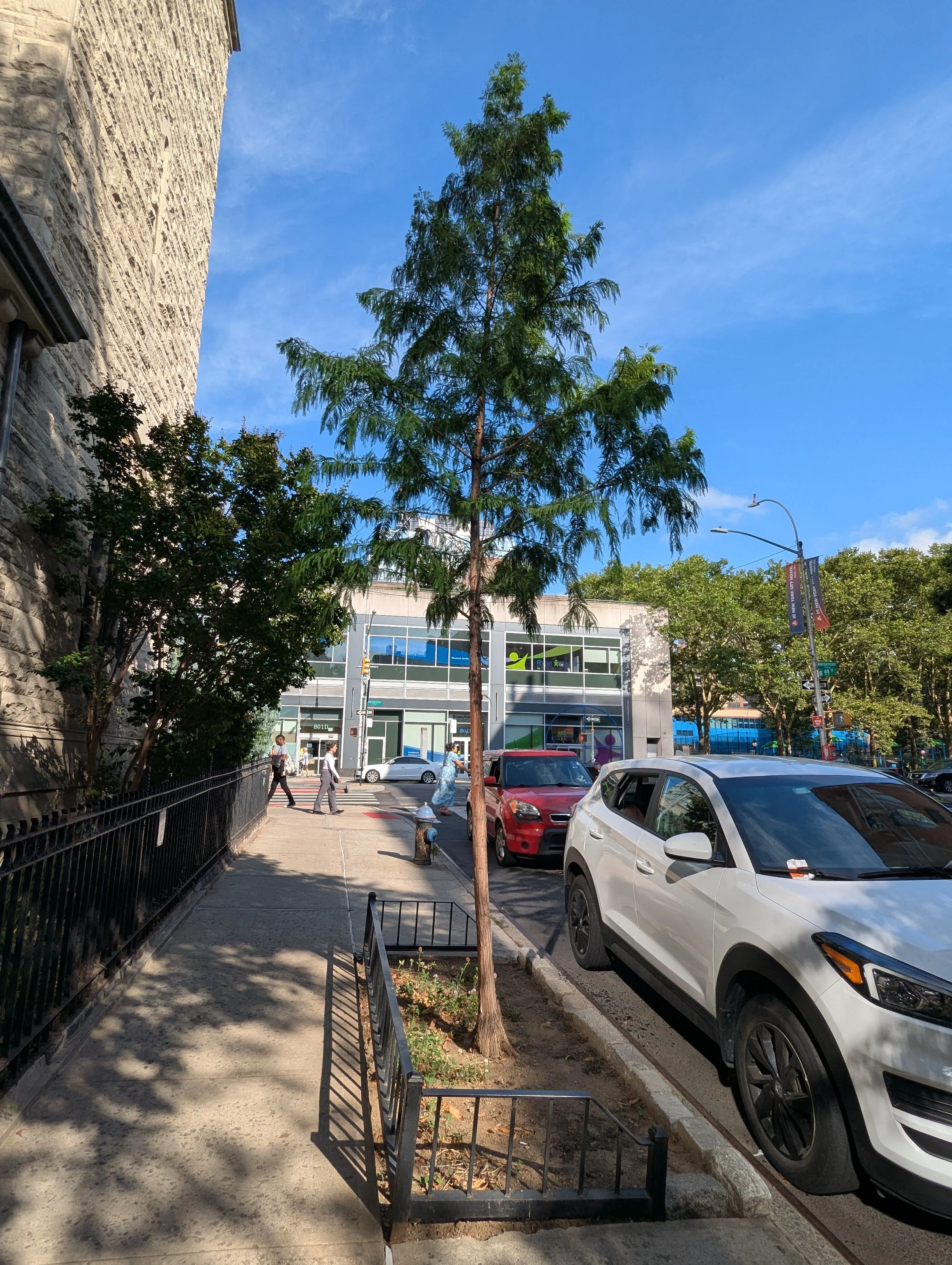The tree well at the east end of the street, beside St. Michael’s Church, didn’t receive this much love. It had been barren for years, filled with compact, pale, clay-like dirt, until another Trafalgar neighbor, Tim, called 311 to request a tree. A bald cypress sapling was planted by city staff in 2020. For a while, the tree looked as sad as the soil supporting it, because unlike most conifers, bald cypress goes bald in winter. In the second year, green shoots emerged. In 2023, we planted a few daffodil bulbs donated by the neighborhood park service. They bloomed once, then vanished.